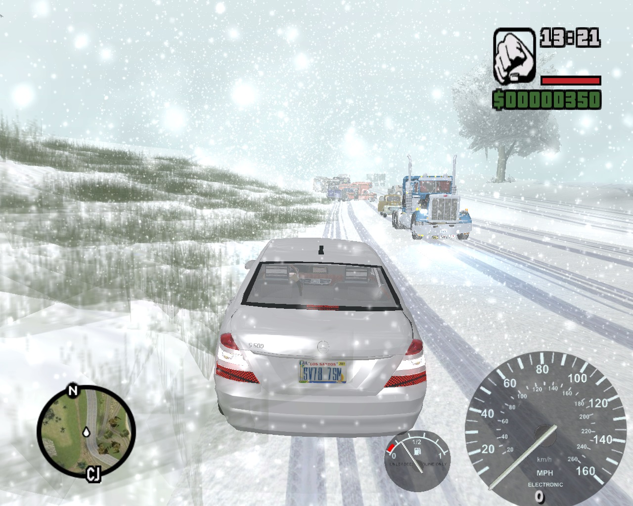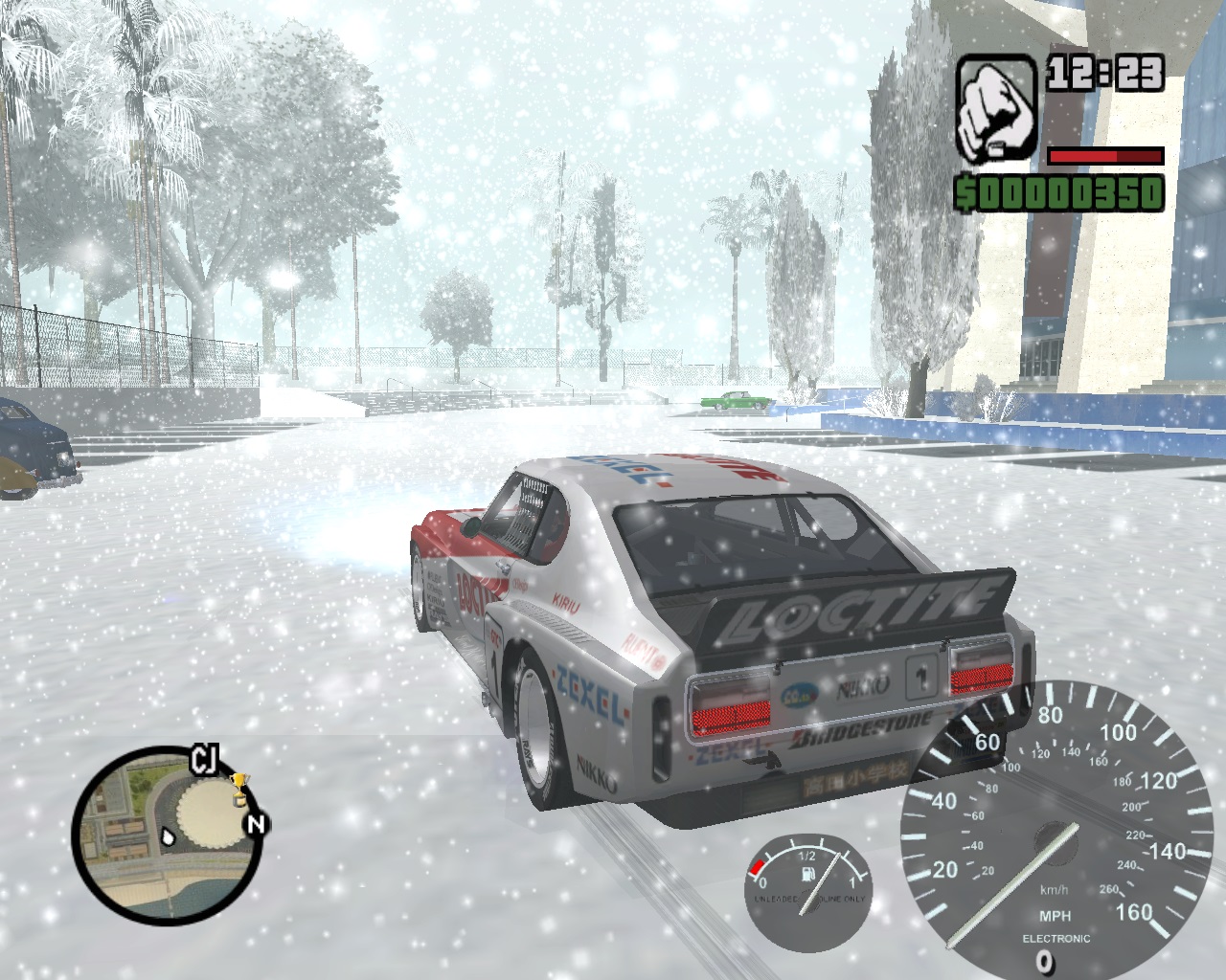 Вместе со снегом в ранее солнечный и жаркий Сан Андреас перекочевала и зимняя одежда, теперь главный герой одет в теплую куртку, которая подбита мехом. Пешеходы вокруг также переоделись по погодным условиям. Также вы можете выбрать погоду, например, можно поставить метель, в таком случае вокруг вас будет хлопьями падать снег. Очень атмосферно получается, правда звуки в игре оставили стандартными, не понятно почему, но это так. То же радио совсем не изменилось, те же станции, те же песни.