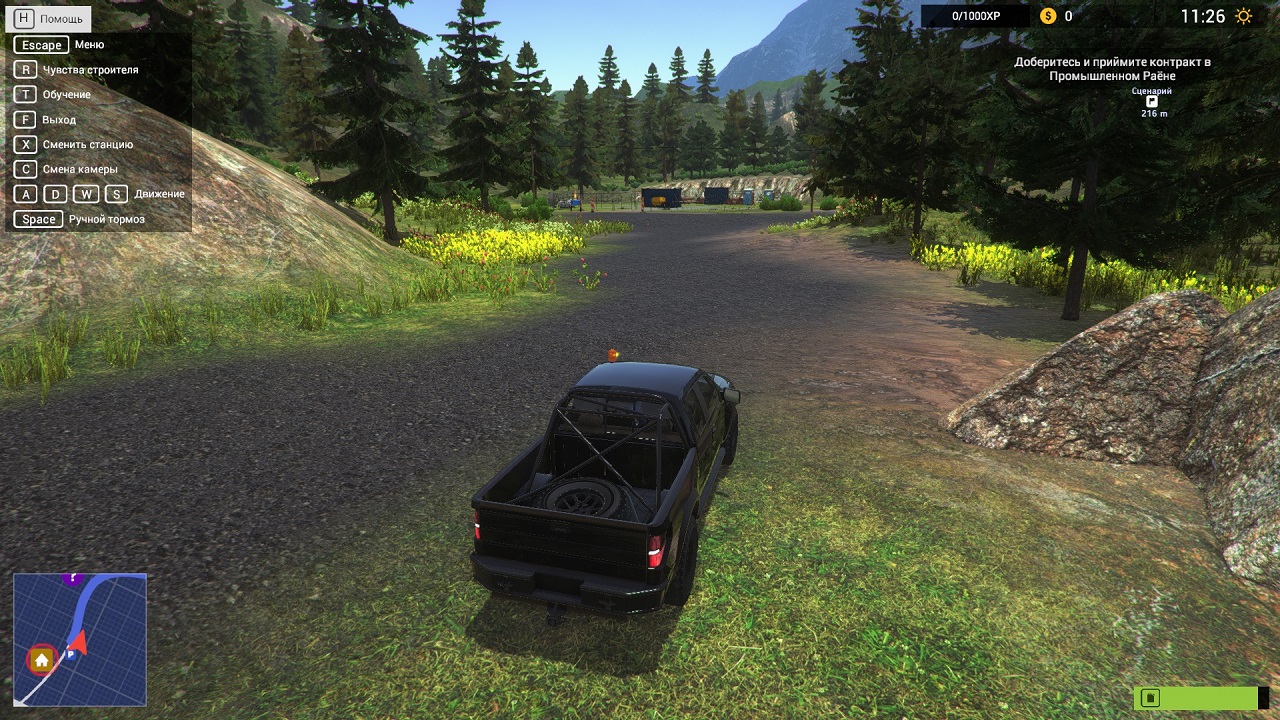 Перемещаться между локациями нужно самостоятельно, вы будете водить весь транспорт и делать всю работы с видом от первого лица. Эта часть игры очень похожа на Дальнобойщики 2 как сути, так и по наличию радио. Тут даже есть элементарная физика, то есть если вы врежетесь в машину на дороге, то ее отбросит, но никаких видимых повреждений ни вы, ни другой участник ДТП не получит. Правда на самом объекте элементы разрушаются достаточно логично и красиво. Чтобы игрок не запутался с заданием, в игре есть возможность включить зрение строителя, которое покажет все доступные для взаимодействия элементы. Стоит также отметить, что русский язык в Demolish & Build Company 2017 присутствует, но качество локализации остается плачевным. Понять все можно, однако некоторые ошибки просто повергают в дикий ужас.