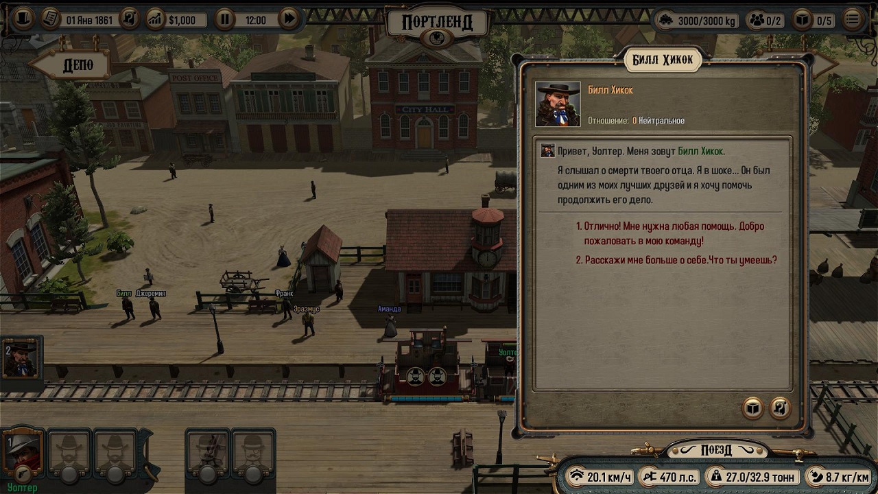 Каждый рабочий имеет три перка – механик, стрелок и канонир. Прокачивайте навыки и бандиты перестанут быть проблемой. В любом городе вы найдете мэрию, где глава города может дать вам задание. Всего в поселениях три активных зданиях, еще есть рынок, на нем покупаются разные ресурсы, кстати, уголь понадобиться в качестве топлива, а также депо, тут можно купить улучшения своего поезда, отремонтировать его и приобрести новые вагоны.
