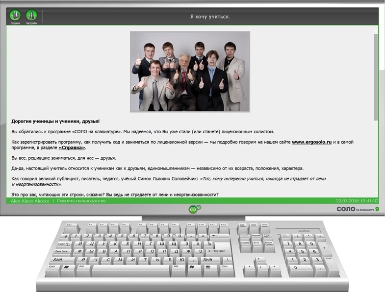 Соло на Клавиатуре — это программное обеспечение, специально разработанное для обучения набору текста на клавиатуре. Вас ждут занимательные уроки с постепенно возрастающей сложностью. Наслаждайтесь простыми, но эффективными уроками, которые помогут вам в кратчайшие сроки освоить столь полезный в наше время навык. Простая и понятная программа становится незаменимым помощником в обучении. Соло на клавиатуре существует уже несколько десятилетий, и за это время метод преподавания Владимира Шахиджаняна зарекомендовал себя более чем хорошо. Пользователей ждет 100 уроков, каждый из которых разделен на несколько этапов. Подсказки поддерживают вас во время уроков и учитывают все опечатки. При таком подходе вы сможете оказать благоприятное воздействие на психику, а мотивационная разметка не позволит вам сдаться на полпути.